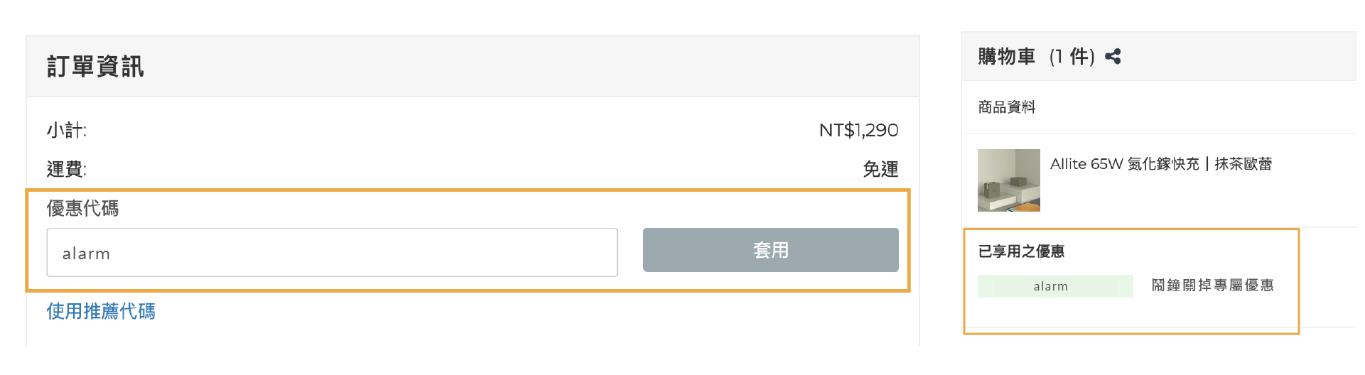 加入購物車後於優惠代碼中